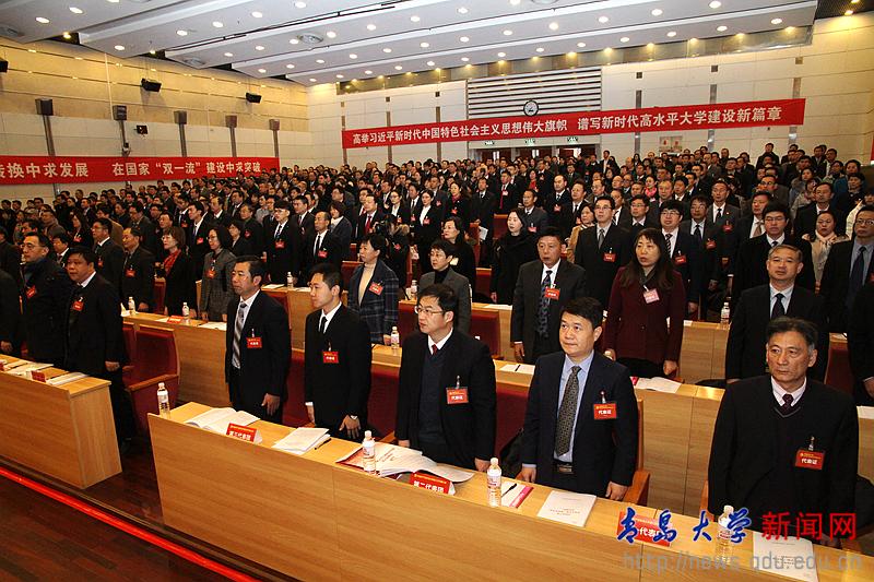 胡金焱同志代表中国共产党青岛大学第二届委员会向大会作题为《勇担使命 奋发图强 谱写新时代高水平大学建设新篇章》的报告。胡金焱指出,中国共产党青岛大学第三次代表大会,是在中国特色社会主义进入新时代、全校上下深入学习贯彻党的十九大精神、学校事业发展进入新阶段的关键历史节点召开的一次十分重要的大会。大会的主题是:以习近平新时代中国特色社会主义思想为指导,全面贯彻落实党的十九大精神,以立德树人为根本,以内涵发展为核心,勇担使命,奋发图强,加快进入国家“双一流”建设行列,谱写新时代高水平大学建设新篇章。夏东伟同志主持大会并宣布中国共产党青岛大学第三次代表大会开幕!全场起立,奏(唱)《中华人民共和国国歌》。