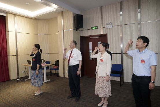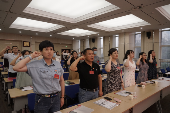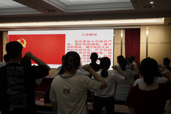 全体师生党员一起高举右手,庄严宣誓。“我志愿加入中国共产党,拥护党的纲领,……随时准备为党和人民牺牲一切,永不叛党。”铿锵恢宏的誓词震撼着在场的全体党员,回顾党员的入党初心,铭记入党承诺,在党旗下接受心灵的净化和洗礼,始终牢记共产党员的政治责任和初心使命和作为一名党员的政治责任和使命担当,永葆共产党员的政治本色。