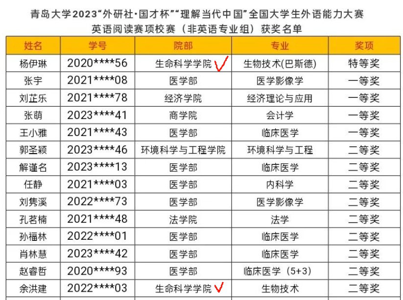 2020级生物技术(巴斯德班)杨伊琳同学脱颖而出,凭借扎实的英语功底,强大的思维能力,过关斩将,荣获本次比赛特等奖,并代表学校晋级参加山东省决赛;2022级生物技术1班余洪建同学荣获本次比赛二等奖。