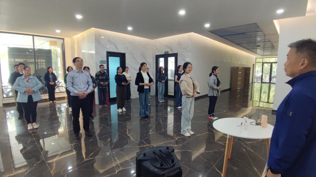 老师们在博雅楼一楼大厅一起学习练习八段锦。