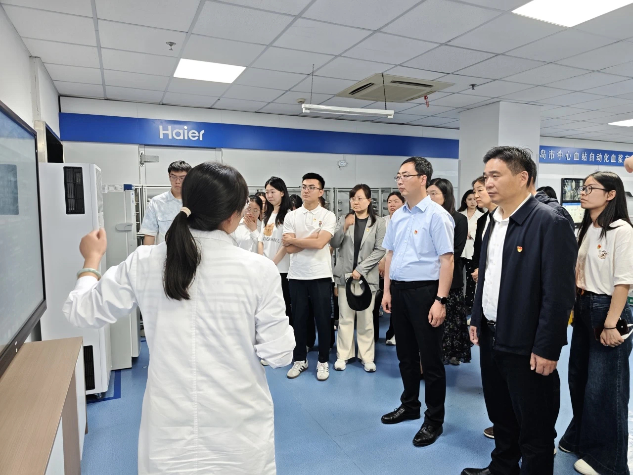 党员们在中心血站工作人员带领下依次参观了青岛市中心血站的机采大厅、成分部、供血部等业务场所以及青岛市无偿献血科普基地。通过参观学习,党员同志们近距离、多维度、沉浸式的了解了无偿献血知识、“四免”政策和“一袋血的旅程”。