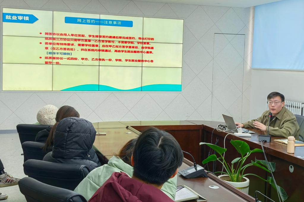 马国成向同学们讲解“山东省高校毕业生就业信息网”中相关内容的填写方式及注意事项,并细致解读《青岛大学“第二课堂成绩单”制度实施办法》